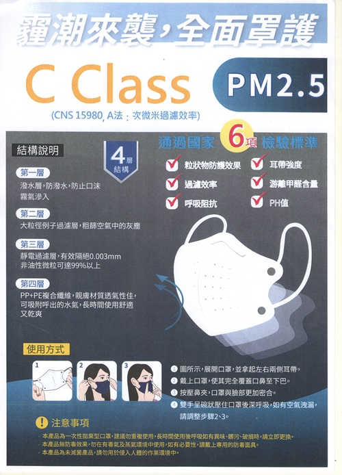(二).商品、製程介紹: 1.試驗方法:CNS 15980「A法:次微米過濾效率」。 2.全程臺灣製造品質好安心。 3.符合國家標準CNS15980防霾(PM2.5)口罩C級防護效果。 *C級已適用於台灣氣候。 *A級適用於超級紫爆地區、中國大陸霾害地區或者其他用途。 4.親膚材質透氣性佳,可吸附呼吸的水氣,長時間配戴好舒適。 5.四層結構,以下說明: (1).第一層:潑水層 防潑水,防止口沫霧氣滲入。 (2).第二層:大粒徑粒子過濾層 初篩空氣中灰塵。 (3).第三層:靜電過濾層 有效隔絕0.003mm非油性微粒達99%以上。 (4).第四層:PP+PE複合纖維層 親膚材質,透氣佳,可吸附呼出來的水氣,長時間使用舒適又乾爽。1. 過濾效果與透氣性佳,氣性佳,具防水透濕效果